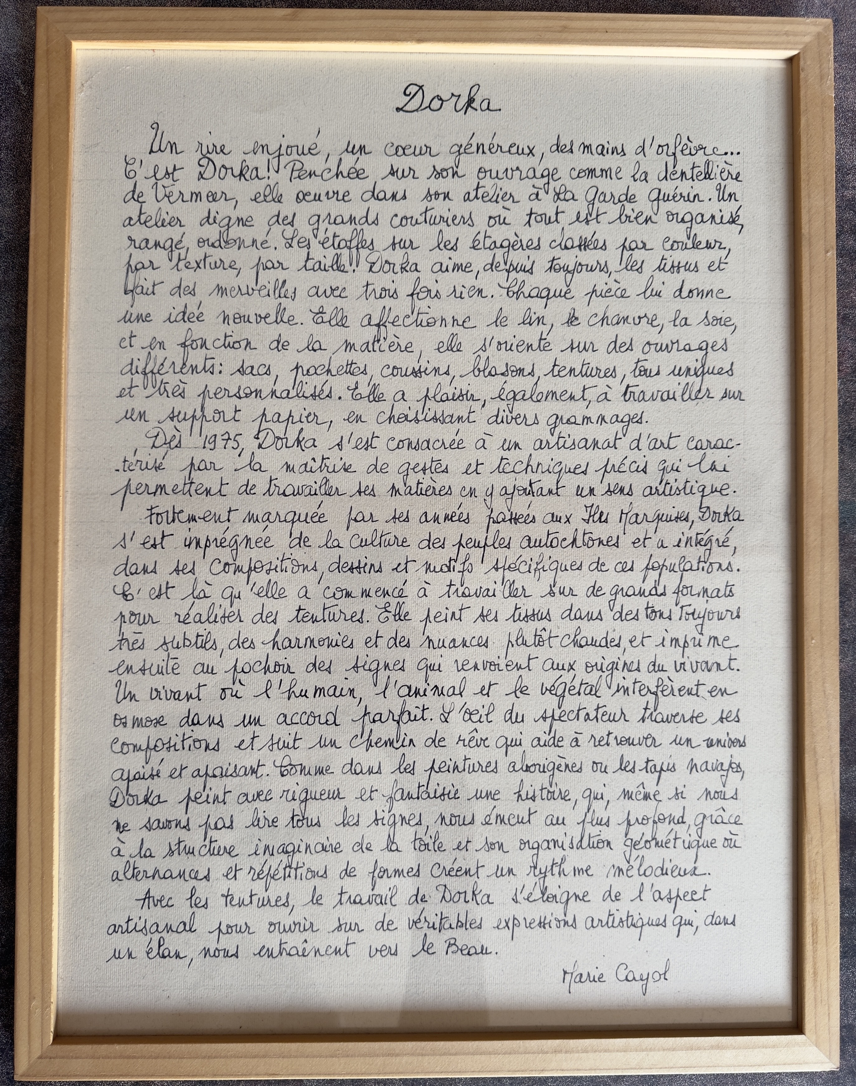 Aidée par son mari, qui très rapidement arrivera à une dextérité surprenante dans la découpe, les pochoirs naîtront à vive allure. Dorka imprime des paréos, puis des tentures et réalise ensuite du tissu au métrage qui lui permettra de créer des vêtements et accessoires.